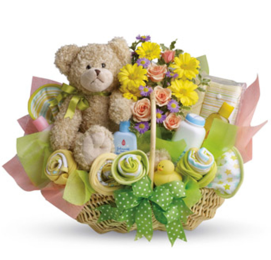 Lucky bear! Make the new parents smile with this charming basket filled with flowers, assorted baby care essentials and a gorgeous teddy bear. Accented with a green satin ribbon, this thoughtful basket is sure to bring joy!